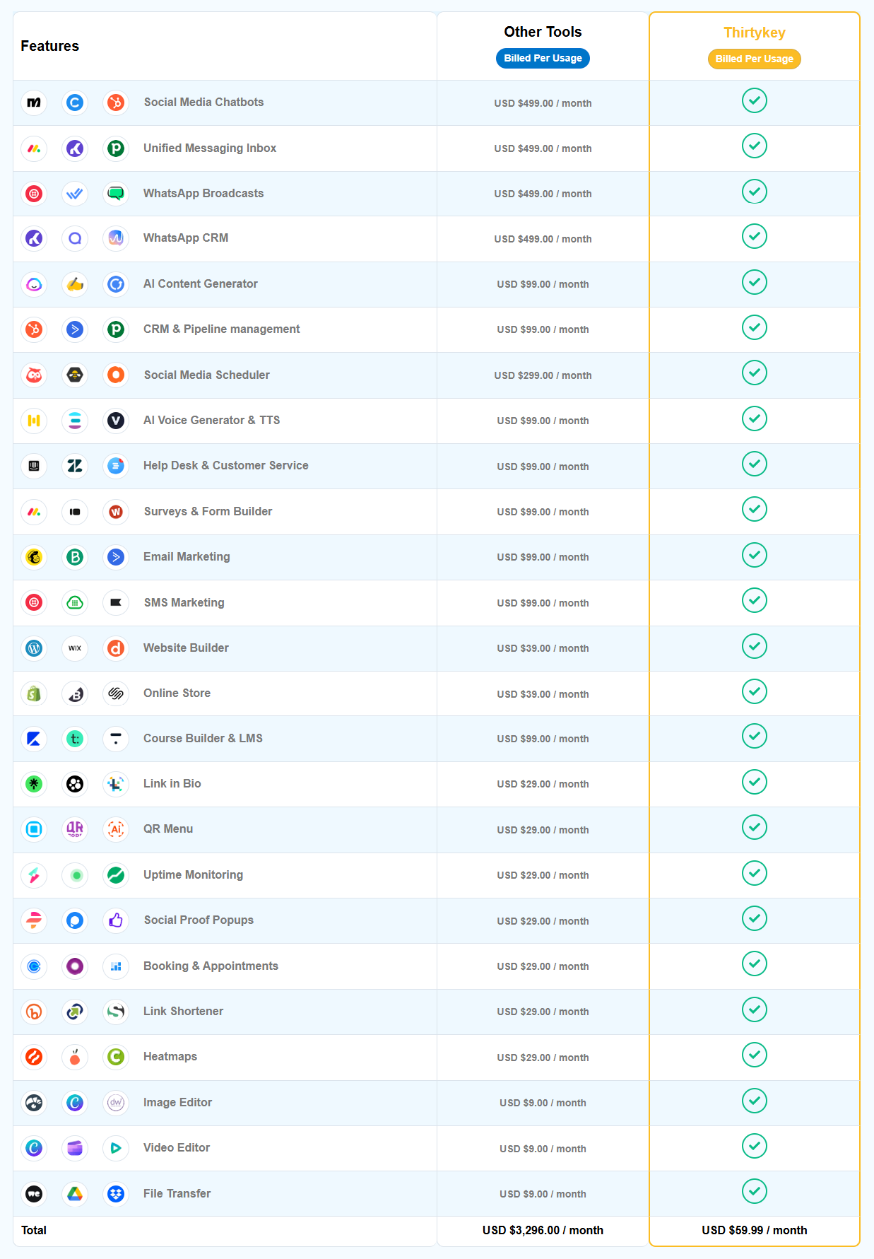 ThirtyKey offers a comprehensive suite of AI-powered marketing and sales tools under one single, affordable subscription. Unlike competitors, all features are unlimited, avoiding additional fees for usage.